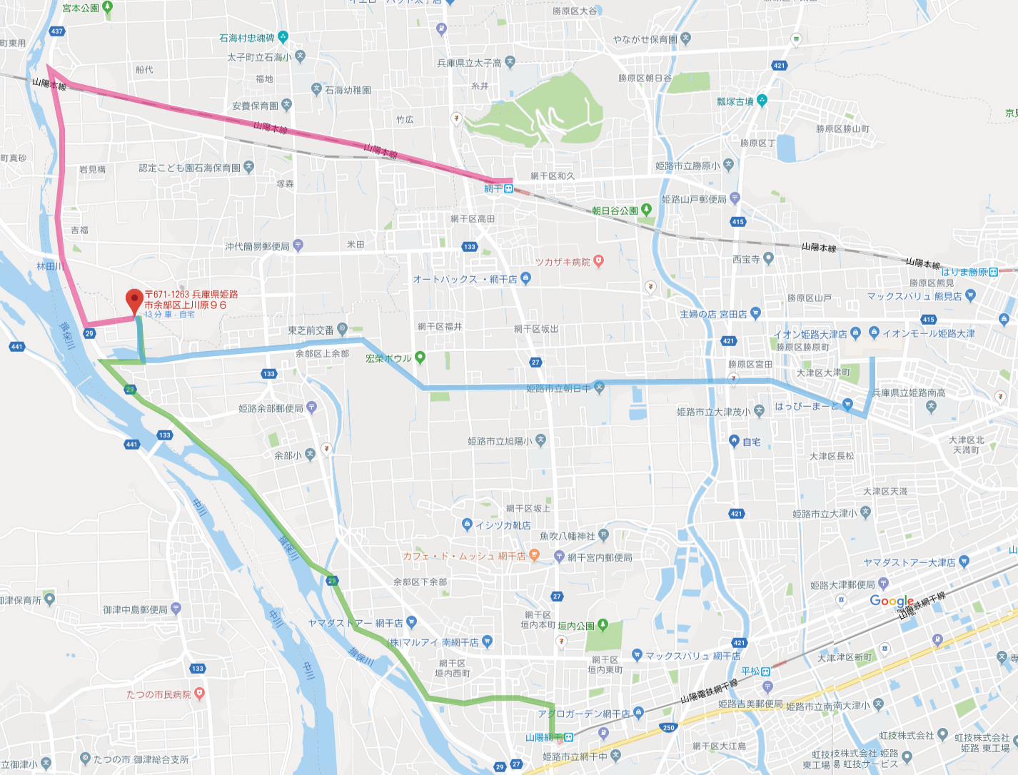JR網干駅から4.4キロ車で12分 ピンクの線